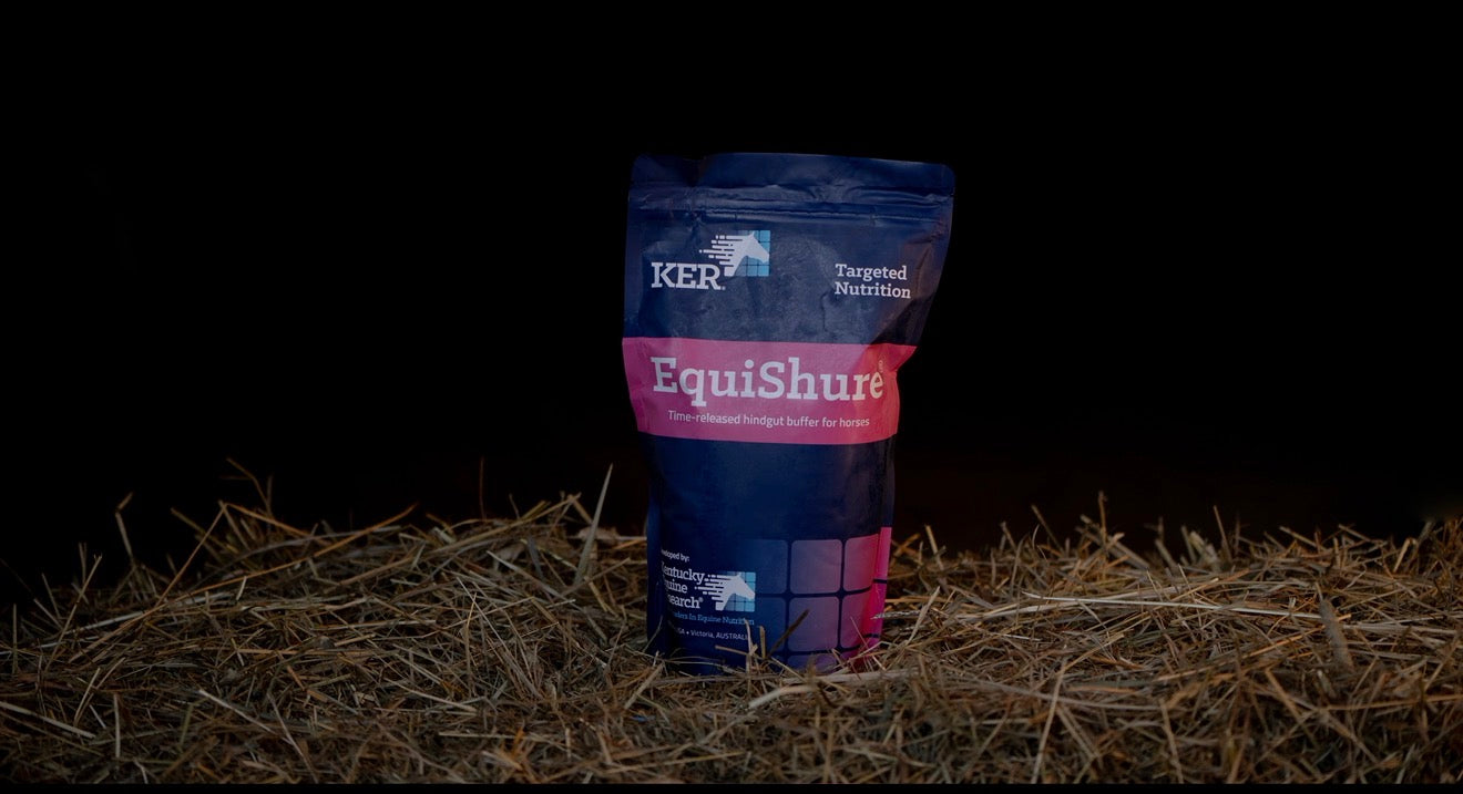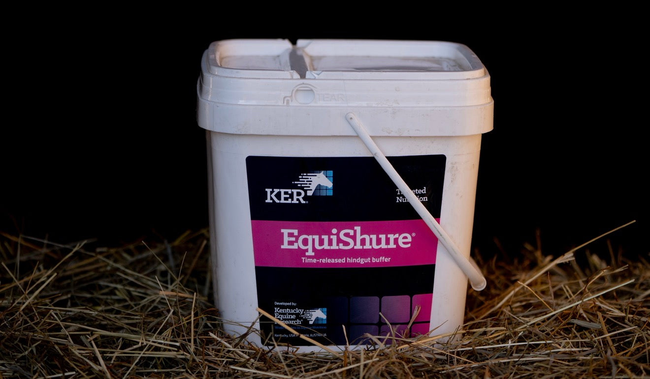 Hindgut buffer for horses with acidosis. EquiShure is recommended for horses on high-grain diets or grazing lush pasture; with inappetence or weight loss; with unexplainable behavioral problems; with digestive upsets resulting in loose manure; prone to recurrent mild colic or laminitis; sport horses under stress of training.